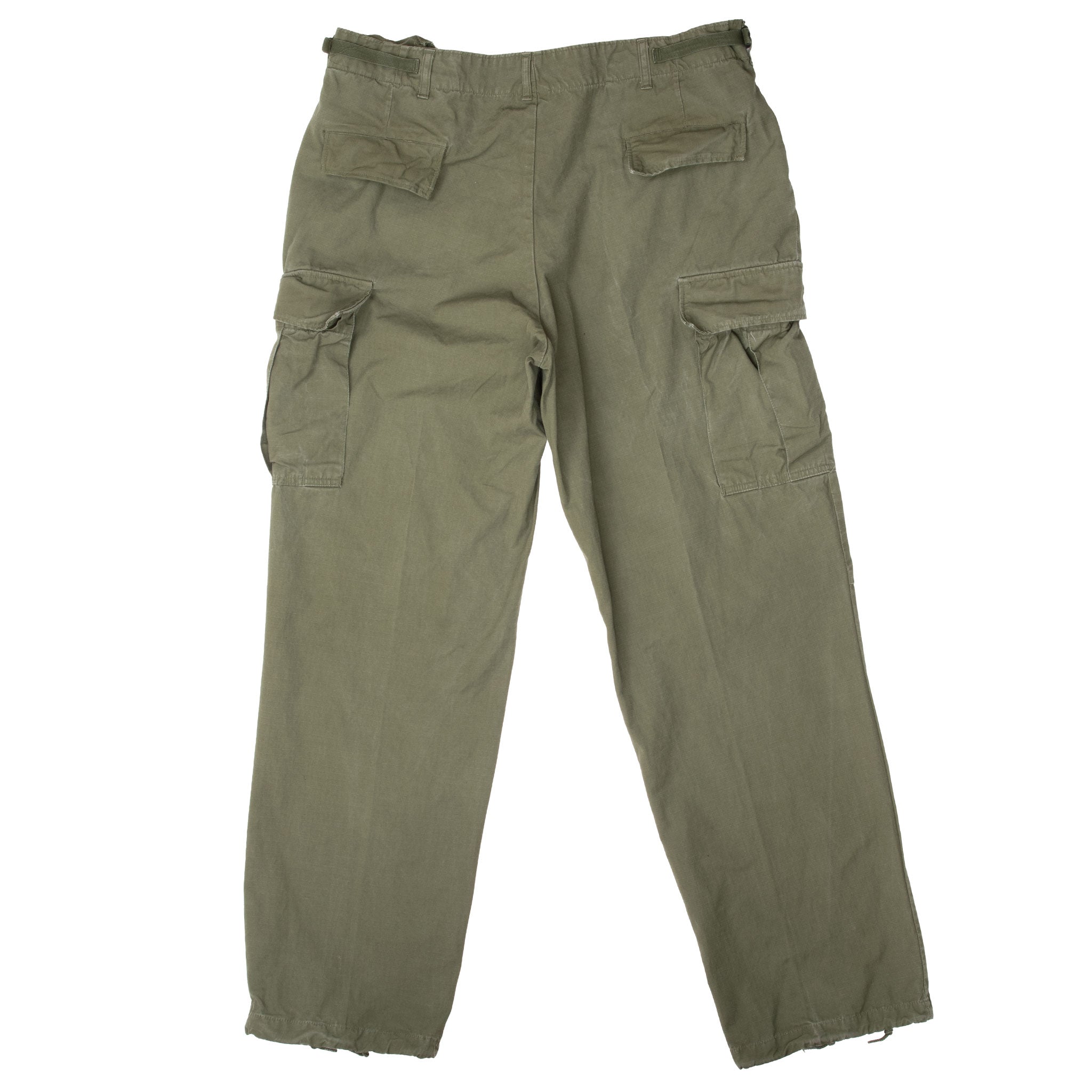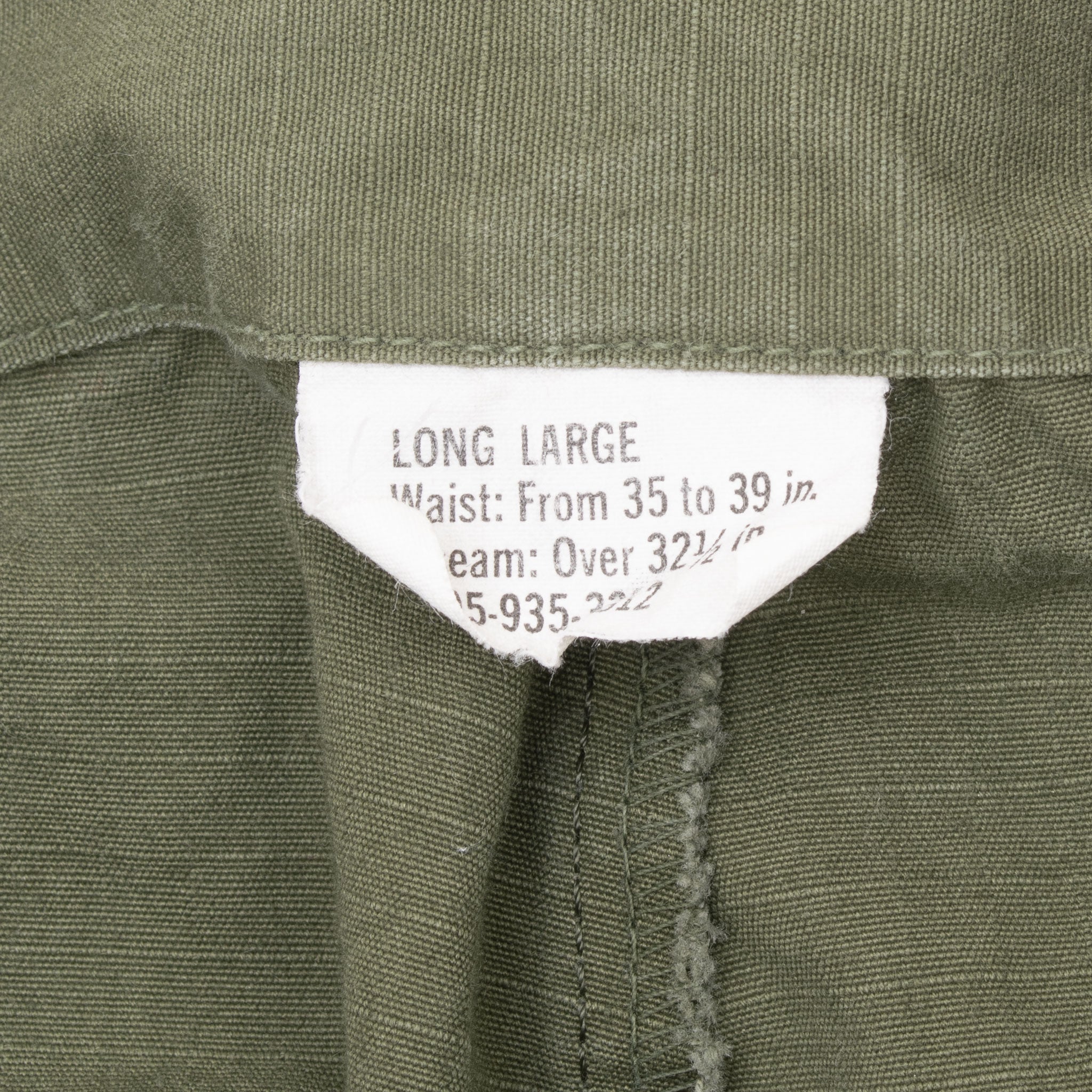 Vintage US Army Tropical Combat Trousers Pants 5Th Pattern Rip Stop Poplin With Wind Resistant Cotton Poplin OG 107 1967 Vietnam War Size Large Regular Waist size adjustable and Length size from Crotch to Botton Hem 33in