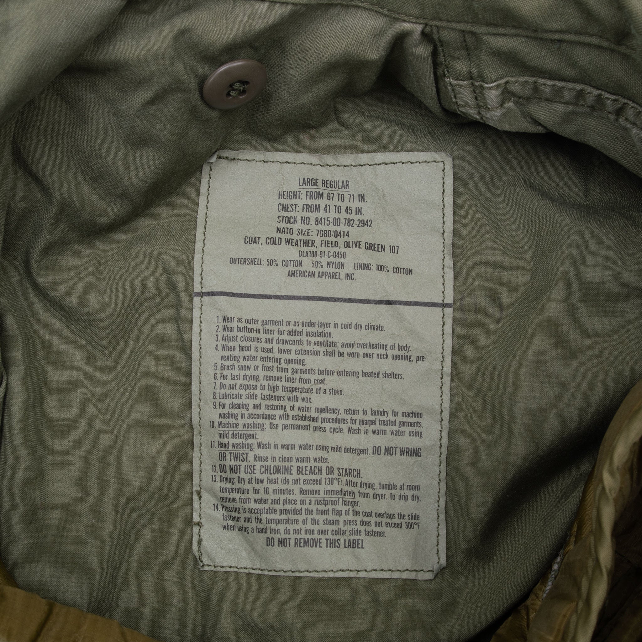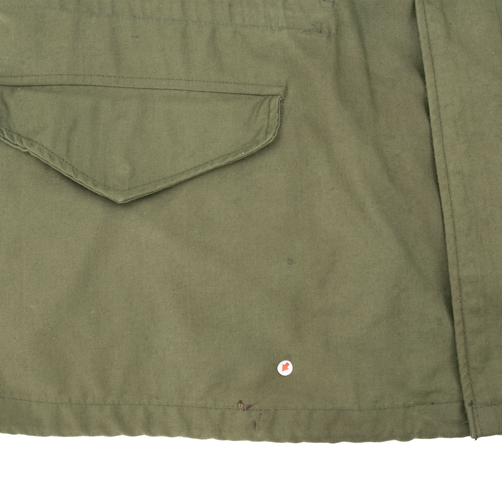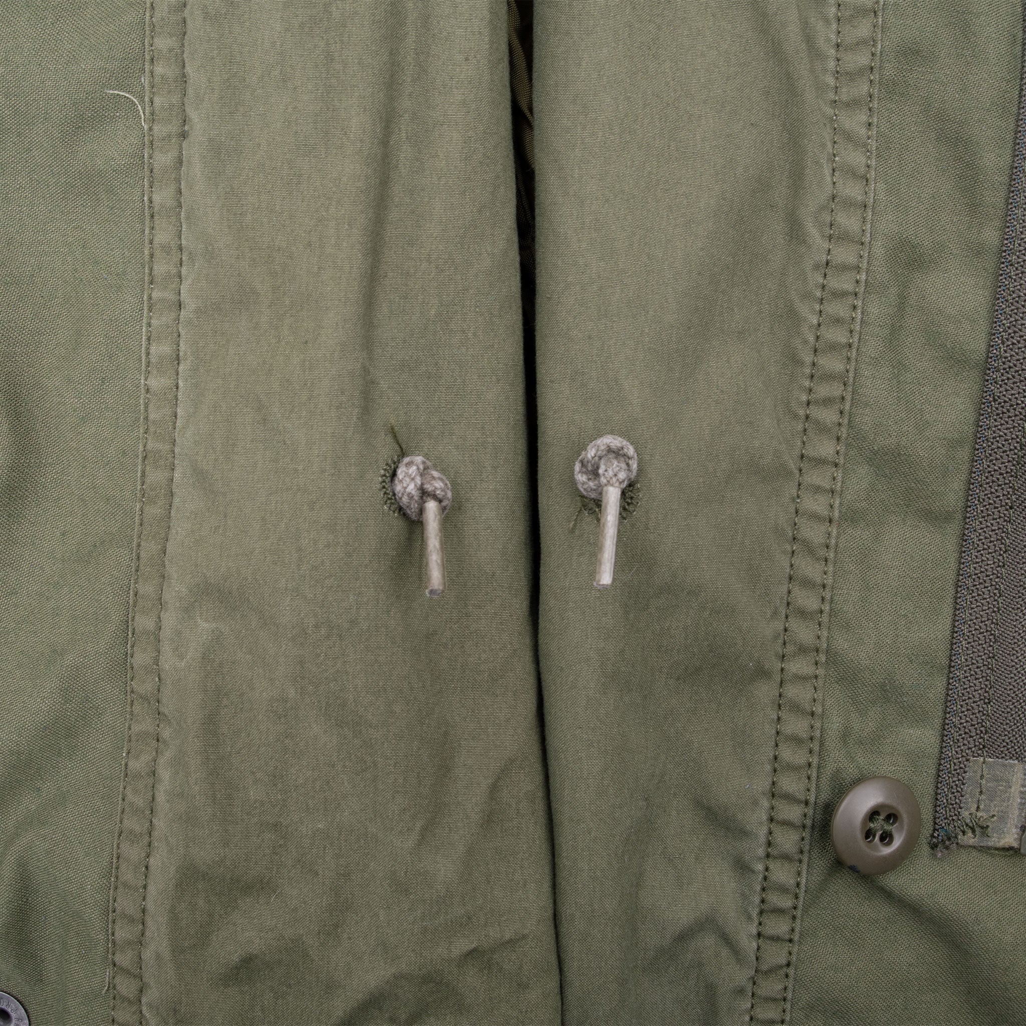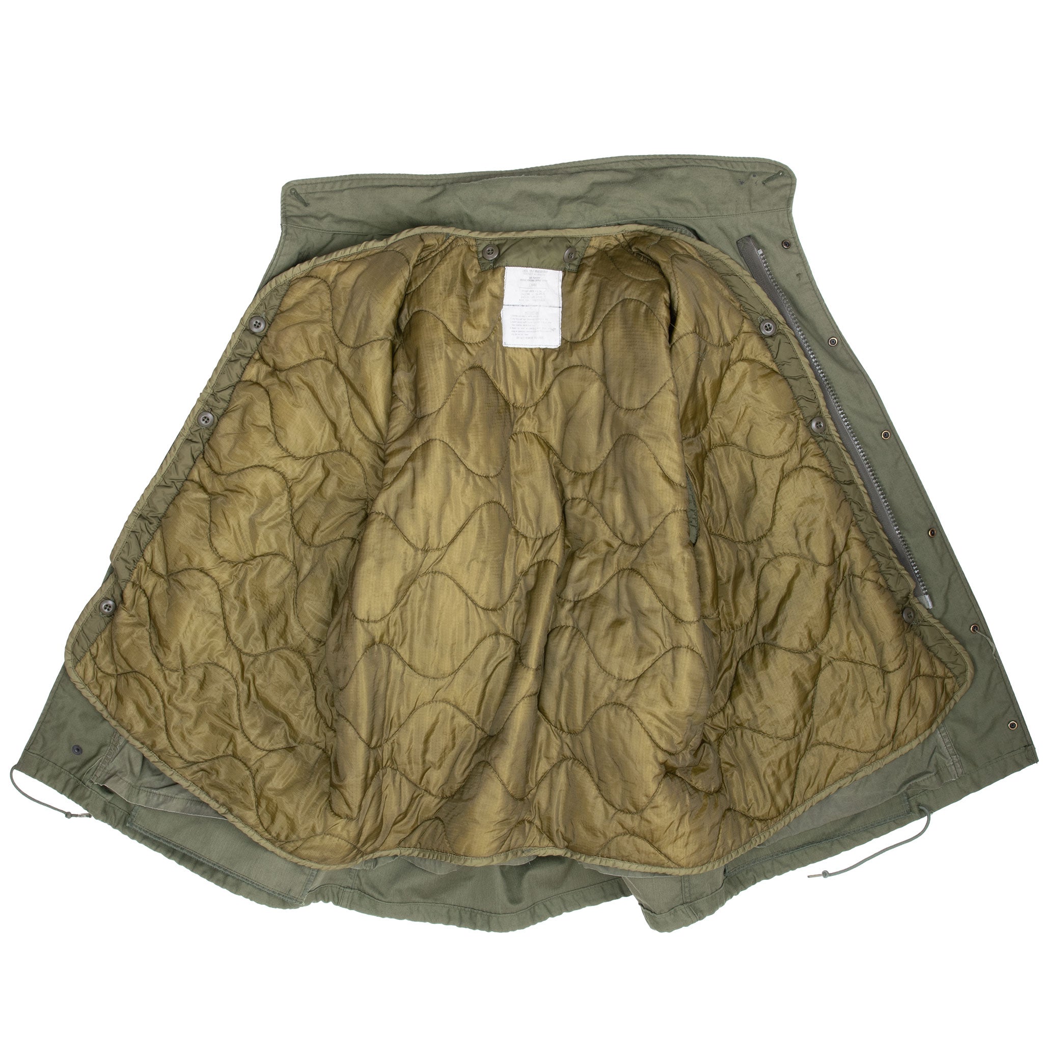 The hip length M1965 cold weather coat was made from OG-107 water repellent and wind resistant cotton-nylon sateen and had a zip front closure and Velcro cuff fasteners. The two bellows type chest pockets and two lower inside hanging pockets were closed by snap fasteners and the hood was zipped into the back of the coat’s rounded collar. Like its M1951 predecessor it had both waist and hem drawstrings and could be fitted with a detachable liner.